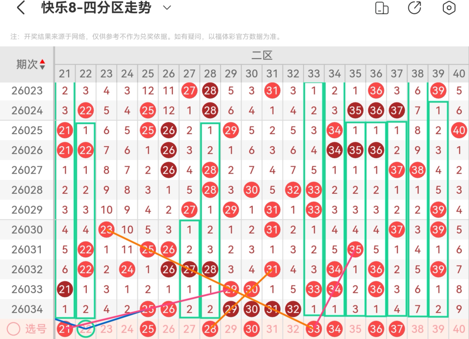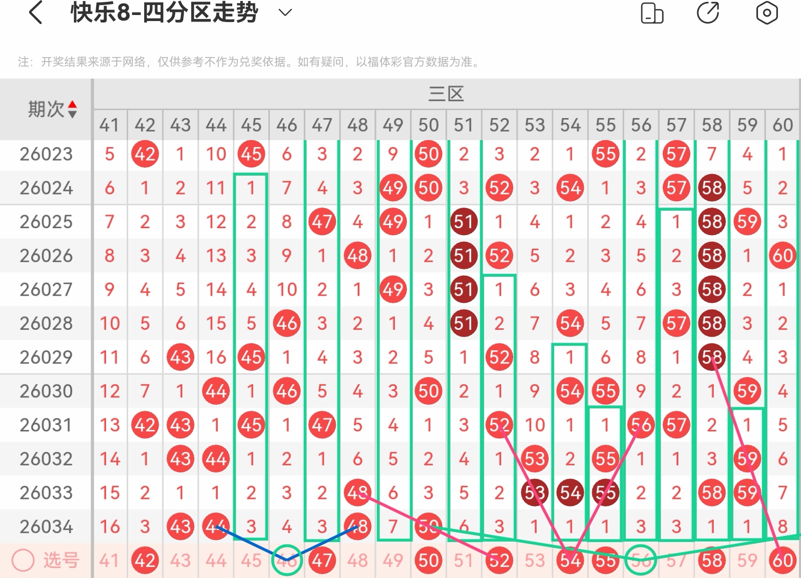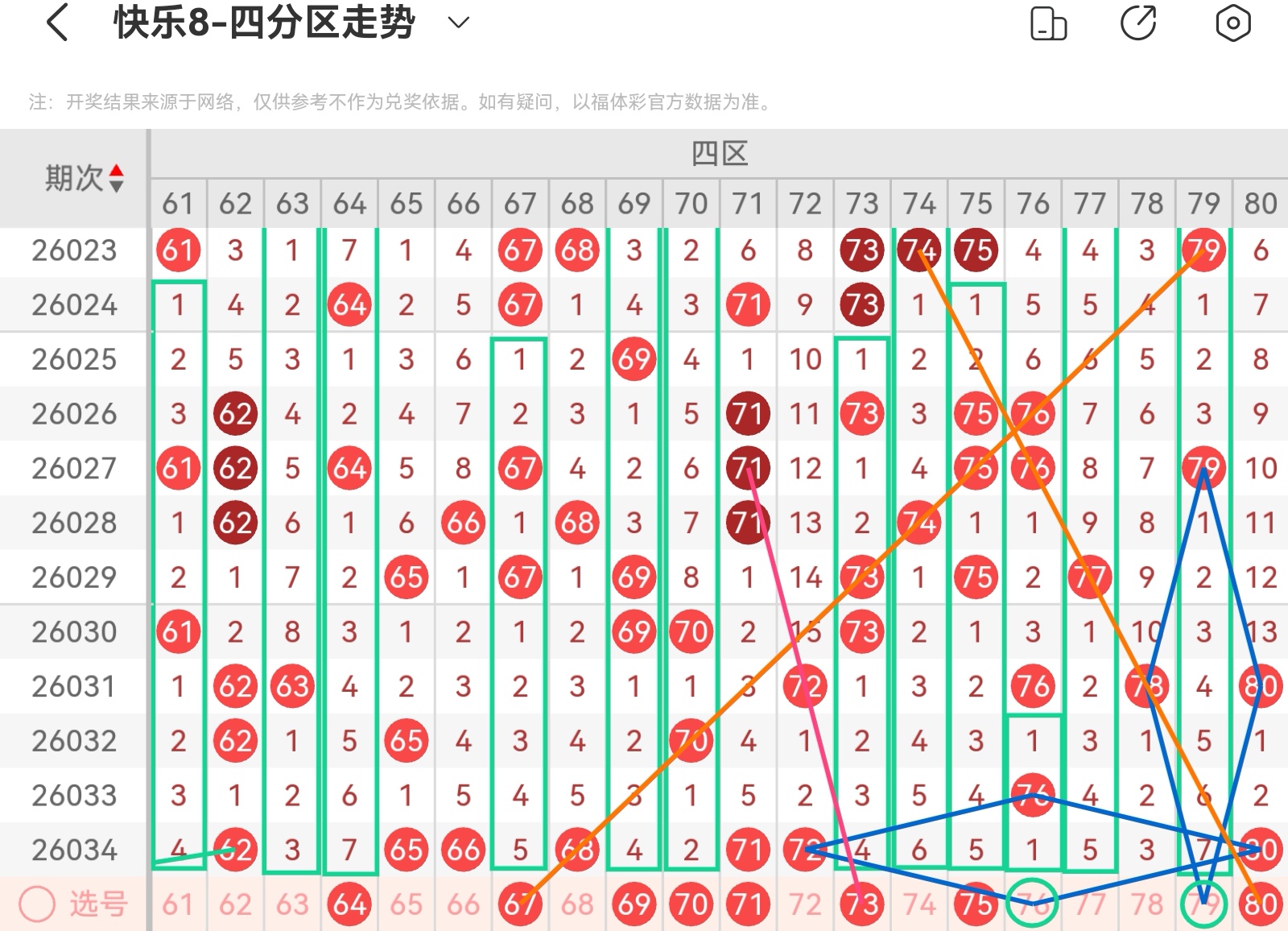 大家好,我是甜丝丝的坏事,主要以快乐八的形态走势、空位走势、遗漏走势以及斜连走势相结合的方法,用公认的四分区走势来进行预测分析,希望能让你有所收获。