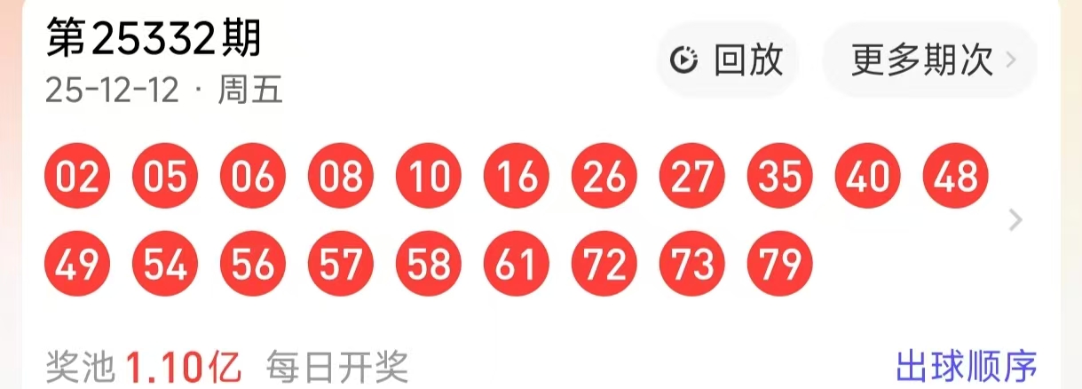 各位彩民朋友,快乐8第25332期官方开奖结果:02、05、06、08、10、16、26、27、35、40、48、49、54、56、57、58、61、72、73、79这20枚号码,咱对着数据聊干货,给333期选号打牢基础: