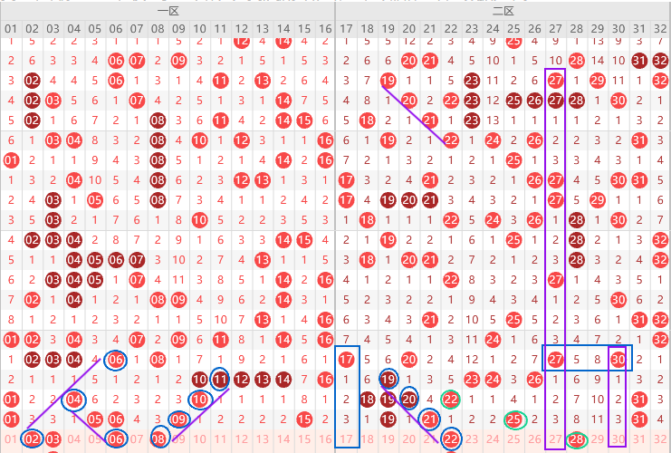 二区胆尾7尾6尾,边号18 20 22 24 26 30 32出一码,重号19 21 25 31出一码,重号防25重号,形态上22 18  28是斜连号,上图已勾画,遗漏值23 24 26三出一,优先26其次24 23,26是6的跟随号,优先关注,算周期今天有7尾,17 27二出一,27全是隔3期下一次,大明号,优先17,可以拿17 27做选二复三,22形态上是跟上面一模一样,完美复刻,28今天防守一期,结论关注五码17 22 26 27 28防20