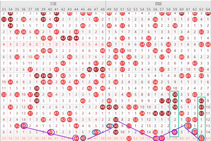 四区胆尾3尾9尾,边号49 51 53 55 57 58 69 61 63出1-2码,重号50 54 56 59 62出一码,形态上56 57 63是斜连号,上图已勾画,0尾最热出5期,本期50 60二出一,其次重号看59,本期大概率有9尾59 49二出一,6开头看60 63,今天63比较合适,形态上是跟59一样,其次63上面二期都是3期遗漏回补,看号小技巧同区太明显的号是需要考虑它的同尾号,本期53也是需要防守,其次51可以关注,之前讲过最近四区遗漏值10期的号是非常喜欢出的,本期51符合可以当拖,结论关注五码49 53 59 60 63防51