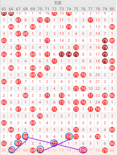 五区胆尾8尾0尾,边号66 68 71 73 79出一码,重号65 67 72 80出一码,形态上66 70 76 是斜连号,上图已勾画,大趋势每个区都出了三直落,只有五区超出10期没出三重号,本期67是有概率出三直落,其次就是72走重,如果有重号就是67 72二出一,其次短期74不爱走重,喜欢隔一期回补,往上看走势图最近几期都是隔一期回补,今天也正点位,可以关注,其次68 78可以追一期,昨天二个没出,而且断8尾,本期是有机会的,算周期9尾69 79本期要二出,9尾这二期要回补一码,,本期67 68 69 有概率出三连号,结论关注五码67 68 69 72 78防80