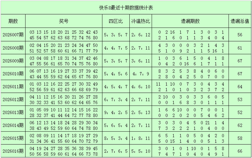 一、快乐8第2026017期奖号分析(定义:遗漏0-2期号码为热码,遗漏3-6期号码为温码,遗漏7期及7期以上号码为冷码,重码为上期开出奖号,邻码为上期没有出现,但与上期奖号差值为1的号码,例如上期开出奖号04,没有出现号码03和05,则本期03和05都为邻码,其它则为孤码。