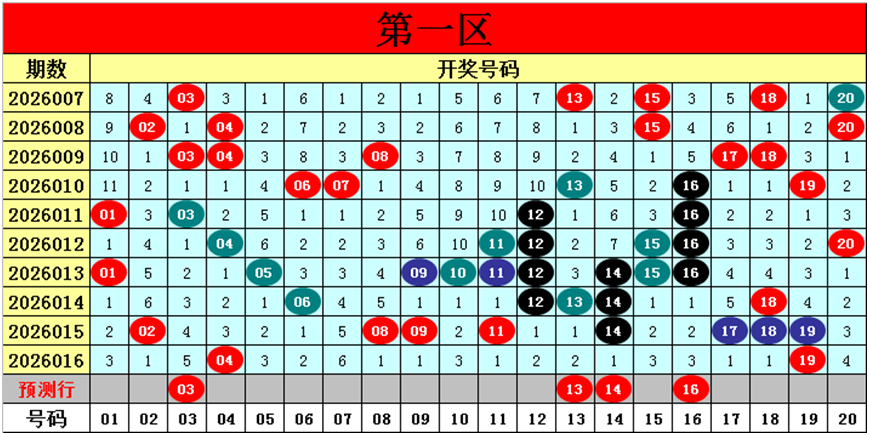 目前第一区包含12个热码:重码2个04、19,邻码1个18,孤码9个02、06、08、09、11、12、13、14、17;包含8个温码:邻码3个03、05、20,孤码5个01、07、10、15、16;包含0个冷码;号码冷温热个数比为0:8:12,重号、邻码、孤码个数比为2:4:14。