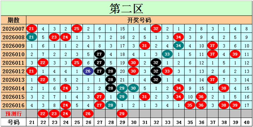 目前第二区包含11个热码:重码7个24、27、28、35、36、38、39,邻码2个29、34,孤码2个30、31;包含7个温码:邻码3个25、26、37,孤码4个21、22、32、33;包含2个冷码:邻码2个23、40,孤码0个;号码冷温热个数比为2:7:11,重号、邻码、孤码个数比为7:7:6。