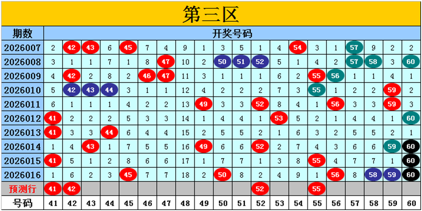 目前第三区包含11个热码:重码6个45、50、56、58、59、60,邻码2个49、55,孤码3个41、43、52;包含3个温码:邻码1个44,孤码2个42、53;包含6个冷码:邻码3个46、51、57,孤码3个47、48、54;号码冷温热个数比为6:3:11,重号、邻码、孤码个数比为6:6:8。