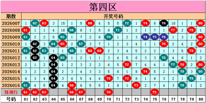目前第四区包含10个热码:重码5个61、64、66、73、78,邻码3个72、74、79,孤码2个70、80;包含8个温码:邻码5个62、63、65、67、77,孤码3个68、69、76;包含2个冷码:邻码0个,孤码2个71、75;号码冷温热个数比为2:8:10,重号、邻码、孤码个数比为5:8:7。