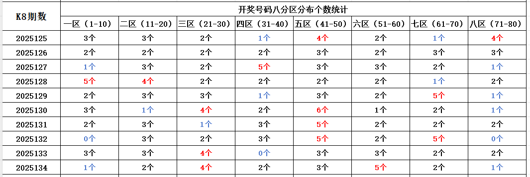 如图,红色字体是热号区,区间开出4个及以上号码。蓝色字体是冷号区,区间开出1个及以下号码。以近10期为一个分析周期,持续走热的区间:三区、五区、六区。持续走冷的区间:一区、四区、八区。依据久热必冷,久冷必热的规律,本期重点关注:三区、五区、六区,区间可能开出3-4个号码。一区、四区、八区,区间可能开出1-2个号码。个人分析,仅供参考。