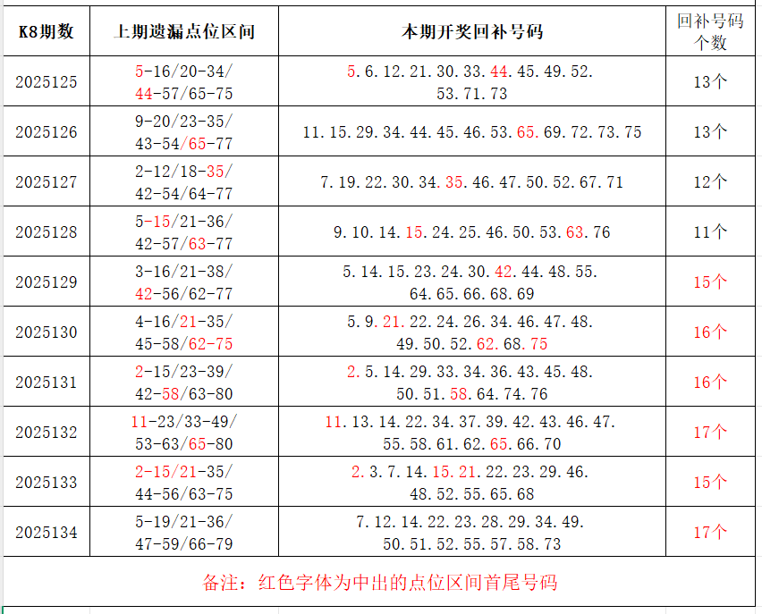 /如图,上期的遗漏号码在下期开出10个左右,即为回补号码。定准点位区间首尾号码是关键!以上期2025133期(会员专区数据)为例,定位4个遗漏区间,围中17码!结合上期开奖号码,以跨度值大于或等于7为依据,本期关注2个遗漏区间:14-22/64-73;重点关注遗漏-区间:****(会员专区可见),区间遗漏号码可能在本期回补开出。注意区分遗漏区间回补号码和大底号码,不要混淆。个人分析,仅供参考。