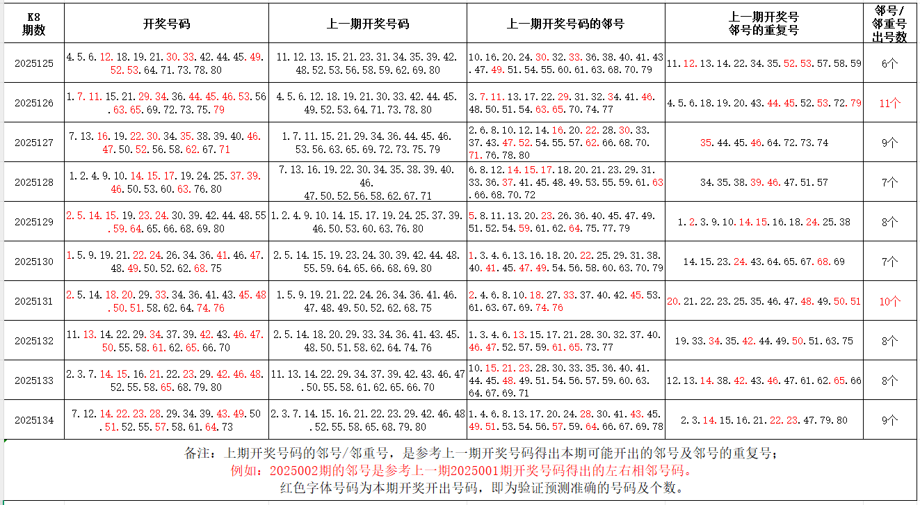 特别提示:有虹友留言,关于邻号和邻重号的数据统计,在此再次赘述:邻号,是指上期开奖号码的左右相邻号码;其中重复出现的邻号,即为邻重号。一定要区分,邻重号不是上期开奖号码的重号,是邻号里的重号。可能新关注的粉丝,还不适应这种统计方法。熟能生巧,无它。统计方法不同,得到的数据结果不同。个人分析,仅供参考。