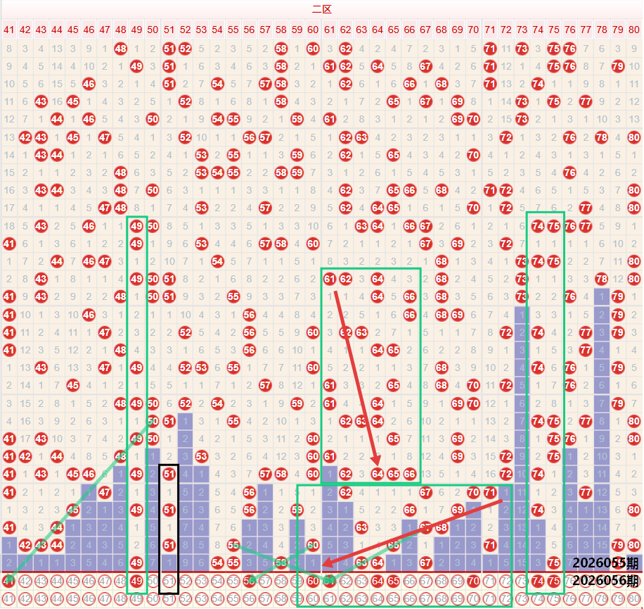 如图所示:在本期大数区的选号中注意在上期的走势中三区间开出了4枚中奖号码,落位在区间均值走势之下,与三区间尾段位置保持急着空位走势,本期注意41的热回补走势,中段位置开出了49的遗漏二期走势,在上方的49号开出了遗漏一期连续5期的走势,在上期开出49之后,本期注意考虑重号走势,以及51目前保持着遗漏一期三期的走势,本期可以考虑第四期的走势,或考虑49 51的双码走势,以及41 51的区间同尾走势,5字头中段位置开出了54 55的二连走势,本期注意56的顶角走势,以及60的遗漏一期走势,四区间上期开出5枚中奖号码,空位区开出了75的回补,本期注意74 76的边号走势,重点注意75的重号走势,在上期开出63 64的二连走势下方注意重号走势,在近期的走势中63并未开出过重号走势,64的重号开出频率较高,本期注意64的重号走势,要注意区间的同尾64 74双码走势,以及64 65的二连走势,同步位置注意60 61的二连走势,以及61 70的小区段首尾走势,另外需要注意在上期开出79的重号走势之后,本期注意冷号78号。
