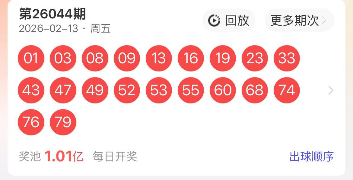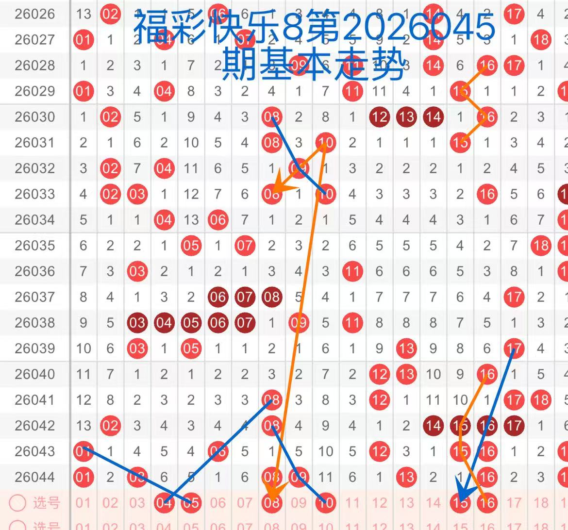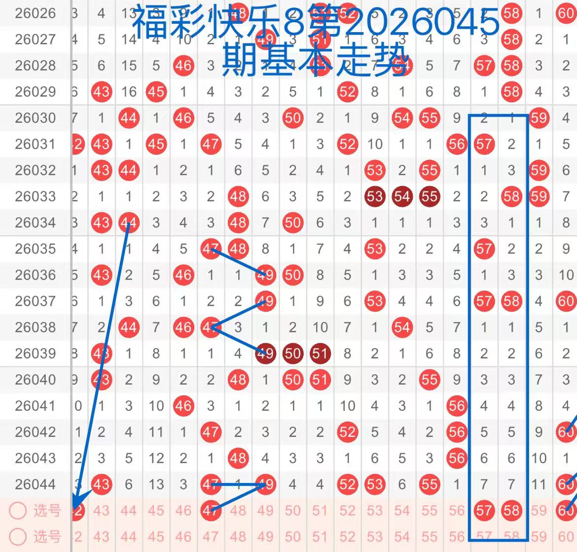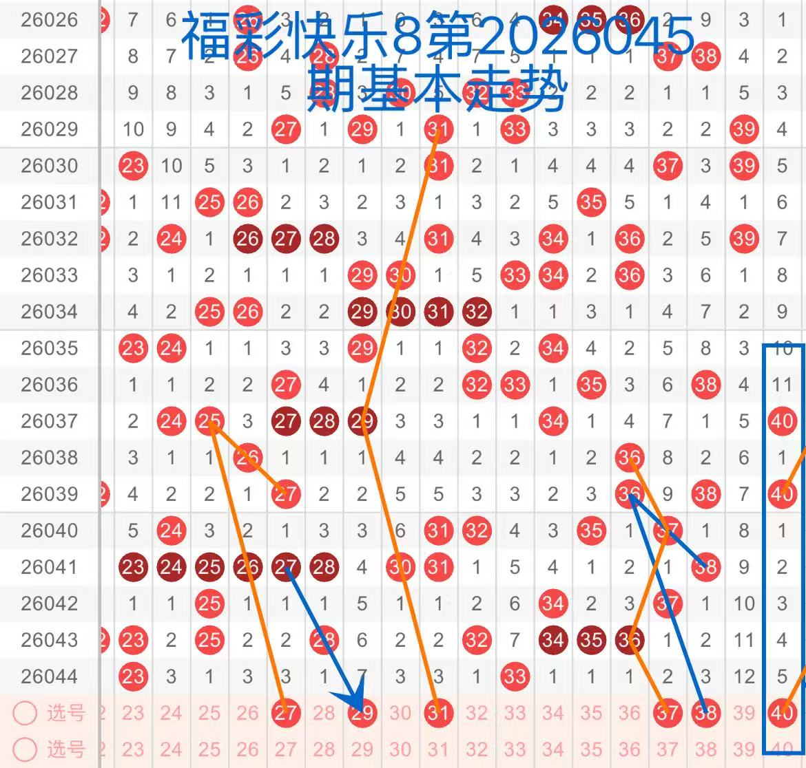 下面是我对2026045期福彩快乐8的分析和预判,希望通过我的分析能让大家今晚大满贯!福彩快乐8上期开奖号码如下图