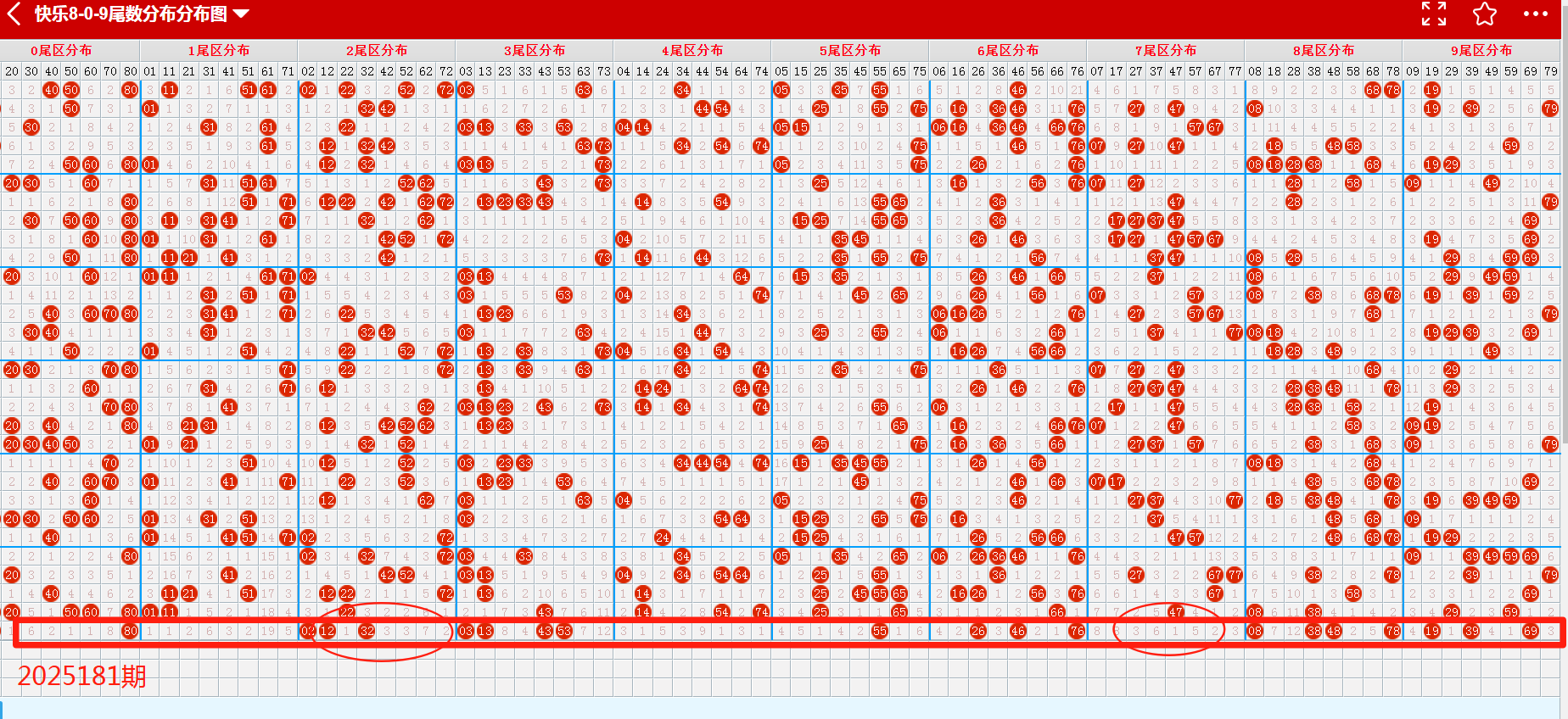 上图是快乐八2025181期区间走势图,从图中看到小号区(1-40)开出11个出奖号码,本期与上期开出数量上升,热度偏温,从小号区近10期出号情况看,整体小号区前区近期偏温趋势;大号区(41-80)本期开出了9个出奖号码,从近期出奖号码个数看属于偏温态势,下期快乐八20250182期大号区号码大概率热度回补,大小区间主看大区号码回补,大小比具体区间比可参考11:9,防10:10比例;再从细分区间判断,分成四个区间,一区(1-20)开出来的号码有7个;二区(21-40)开出来的号码有4个;三区(41-60)开出来的号码有5个;四区(61-80)开出来的号码有4个;数据上看本期出奖号码集中分布在一、三区。从号码落位区间形态上看,快乐八20250182期主看三、四区热度回补的态势,出奖号码几率较大,需要密切关注。