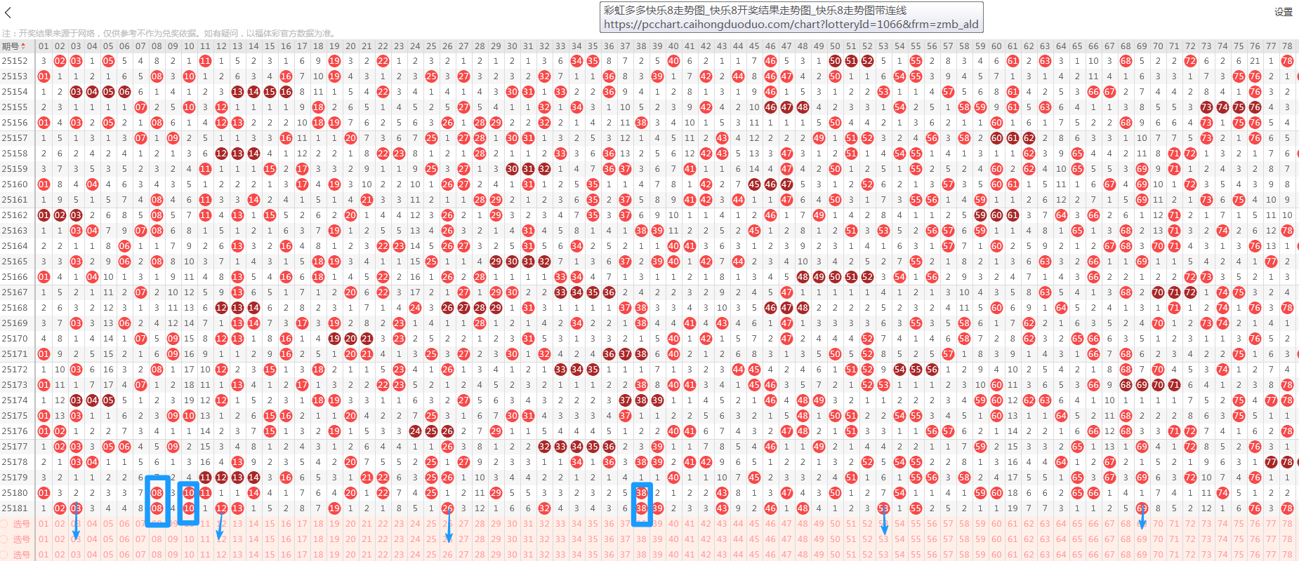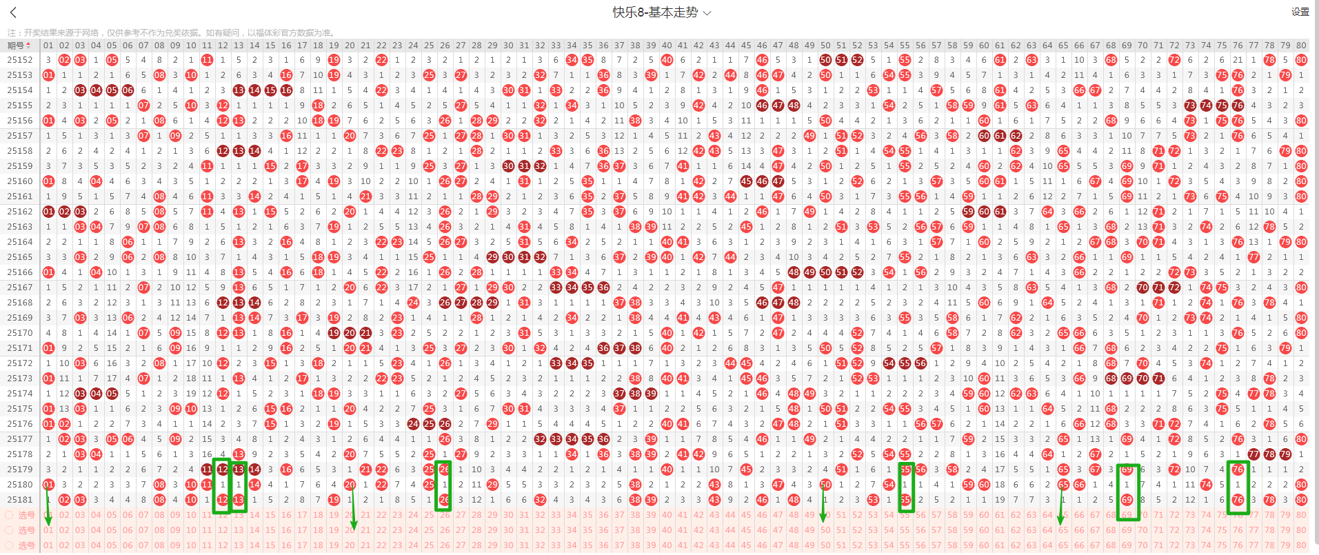 从这张走势图可以看到我画标出来了遗漏示意号码,隔期(遗漏一期的)6个号码(绿色方块标示的),从近期走势图看隔期有走热态势,本期判断4个(绿色箭头标示的:01、20、50、65)需要关注,有下号概率;