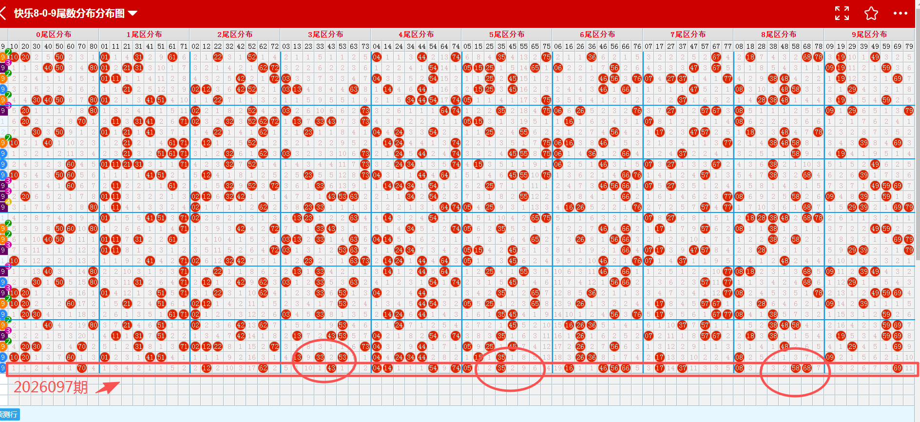 上图是快乐八2026097期的尾码走势图,从图中看0尾到9尾出号个数依次是:0尾号码区开出1个;1尾号码区开出0个;2尾号码区开出2个;3尾号码区开出1个;4尾号码区开出4个;5尾号码区开出2个;6尾号码区开出4个;7尾号码区开出2个;8尾号码区开出3个;9尾号码区开出1个;再看小尾号码(0尾-4尾)区有8码,大尾号码(5尾-9尾)有12码;数据比对统计后可以看到本期4、6尾出号数量最多,一共开出了8个中奖号码。本期1尾区出现断区!由走势比对推断2026098期重点需要关注3、5、8尾区号码下号热度回补和落号数量增加的概率较大。