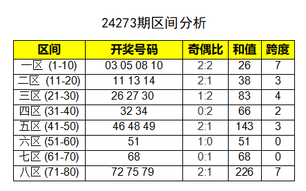 形态数据分析:上期一区开出:03,05,08,10 奇偶比: 2:2 和值:26 跨度:7,二区开出:11,13,14 奇偶比: 2:1 和值:38 跨度:3,三区开出:26,27,30 奇偶比: 1:2 和值:38 跨度:4,四区开出:32,34 奇偶比: 0:2 和值:66 跨度:2,五区开出:46,48,49 奇偶比: 2:1 和值:143 跨度:2,六区开出:51 奇偶比: 1:0 和值:51 跨度:0,七区开出:68 奇偶比: 0:1 和值:68 跨度:0,八区开出:72,75,79 奇偶比: 2:1 和值:226 跨度:7。