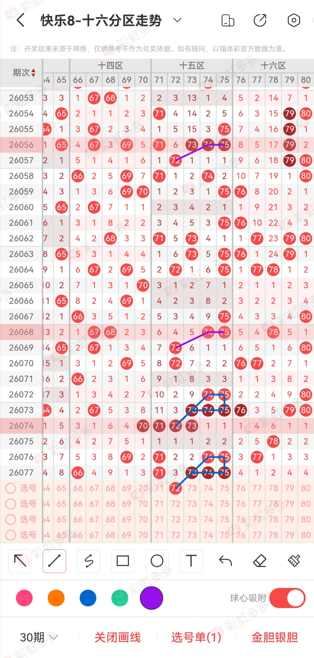 第二个地方比较明显,昨天晚上也和大家提到,72这个号码太敏感。能不能再来一次,历史数据就在近期,74 75同出顺位72。或者说走重顺位72。而且还有比较有意思的方块存在。近期的方块特点都是同出3码,我们能够找到几个地方。大家对比一下看看。但是哈,这里的72我没有太多的想法,当然这个号码会做,放在拖码里面。我想很多人都和我想的一样,27 72同出,要么09 72同出。背靠背居多,和值也有可能。前面两天10 71同出,11 70同出。那么顺位是昨天09 72同出。只不过昨天没有出现,那么这里有争议,极有可能只会单开。所以72大家自己定位,当然还有一个更大的可能就是71-75空区。近期没有出现的好看点位都是空区,小范围空区。其次这里的72是不是出73,毕竟第一次的单码,和第二次的方块,条件变多,就类似于昨天的20没来,有其他号码存在走重。