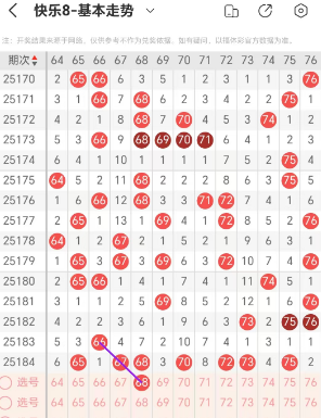 68码,如上图所示,与往期奖号66 67码形成一个斜3连,所以看好。