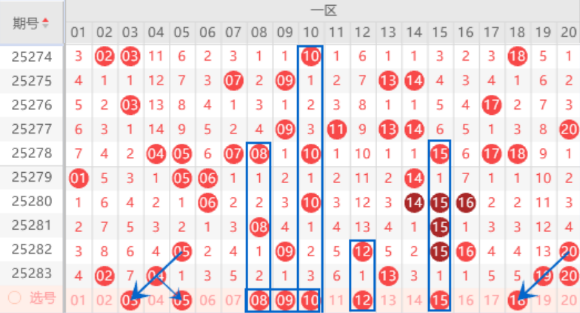 该区间的03号数字我们防守一下出号情况,属于三斜连号码,本期可以防守一下03 10号数字同出的情况。本期的08号数字是属于空二对称号码,09号数字是属于141走势,10号数字是属于313走势,都是有出号机会的,我们可以重点关注一下,其中的08 10号数字可以重点关注一下。本期的14 15 16号数字是属于重号15号数字的边号回补号码,本期是有机会出一个号码的,其中的14 15号数字我们可以重点关注一下。本期的18号数字是属于三斜连号码,可以关注一下出号情况。