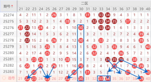 该区间的23号数字是属于重号阶梯号码,本期我们注意一下出重号的情况。本期的25号数字是属于夹号回补号码,出号机会是有的,本期可以防守一下23 25号数字同出的情况。本期的30号数字是属于131走势,本期可以防守一下出号情况,本期可以关注一下28 30号数字同出的情况。本期的34 36号数字是属于交叉对称回补号码,本期我们防守一下出一个号码的情况,其中的34号数字可以重点关注一下。本期的39号数字是属于对应斜连号码,出号机会也是有的,可以关注一下。