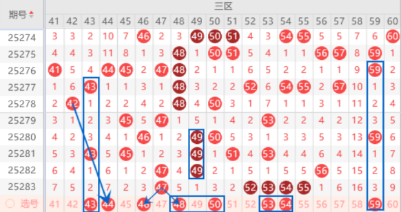 该区间的43号数字是属于432走势,本期是有出号机会的,我们可以防守一下43 44号数字同出的情况。上期开出了47号数字的重号,本期我们注意一下走分边的情况,所以本期的46 48号数字我们要注意出一个号码的情况。本期的48 49 50号数字是属于重号49号数字的回补号码,本期是有机会出一个号码的,其中的48 50号数字可以重点关注一下,所以本期的48要重点关注一下。上期开出了52 53 54 55号数字的四连号,本期我们关注一下出重号的情况期,其中的53 54号数字我们可以做重点关注一下。