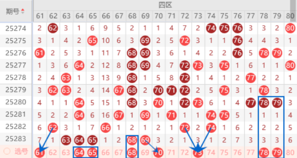 该区间的61号数字我们注意一下出号情况,属于回补号码,本期可以防守一下61 79号数字同出的情况。上期开出了63 64 65号数字,本期我们注意一下出重号的情况,其中的64 65号数字可以重点关注一下。本期的68 69号数字我们也是要注意出重号的情况,其中的68号数字可以重点关注一下,本期可以防守一下68 70号数字同出的情况。三连号77 78 79号数字断号3期了,本期我们注意一下落下一个号码的情况,其中的78 79号数字可以重点关注一下。