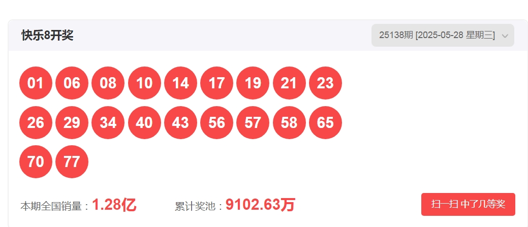 一、快乐八2025138期开奖号码:
