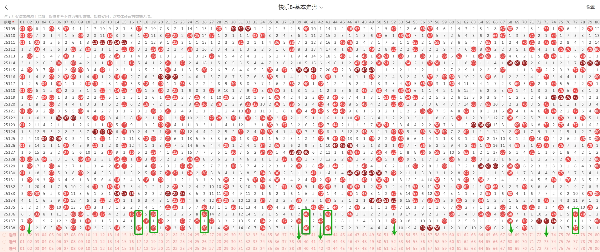从这张走势图可以看到我画标出来了遗漏示意号码,隔期(遗漏一期的)5个号码(绿色方块标示的),从近期走势图看隔期有走热态势,本期判断6个(绿色箭头标示的:02、39、42、52、68、73)需要关注,有下号概率;