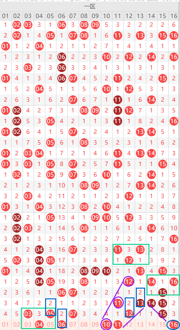 边号2 4 6 8 11 13 14 16出1-2码,重号防守3 5 7 12 15出一,5尾5 15已经出6期,短期内热尾最大周期就是6期,本期大概率会断,其次3尾出2期,防3出重,0开头走热,1-9区间本期应该2-3个,1开头走冷2码左右,形态上10 11 16是斜连号,上图已勾画,夹子号最近出号频繁,本期4 6拿一码,遗漏值隔2期号出2期,本期6是唯一隔2期号,看不上就拿4,关注五码1 2 4 6 10防14