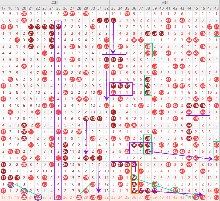 上期三区走热本期可以跟一期,应该最少出4码,边号35 40 41 43 47出一码,一区上期出15三直落,如果15断应该是回三区,之前讲过,比较稳定的趋势,那么本期35 45概率较大,优先35,看上图勾画38三直落断回48,本期36如果不出4重号,优先46,本期36 46可以选一,形态上35 38 45是斜连号,8尾不单出,38是大明号,上面全是重号出,喜欢就用,逆向思维就是48,看上图勾画三连号,四连号下面一直出重号,出5次了,正常本期36 37 38 39应该有出一码,有点冒险,建议优先重号48,概关注五码35 38 44 46 48防33