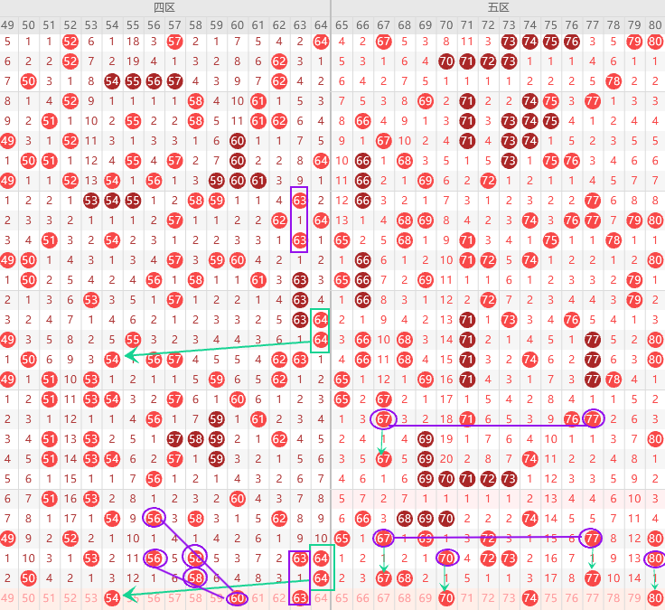 边号49 51 57 59 63出1-2码,重号50 58 64出一码,重号50是明号喜欢就用,形态上60是斜连号,上图已勾画,63是上面复制形态一模一样,三直落第二次回补隔一期再出一次,看不上63选53,本期最看好63 53二出一,其次64热尾如果不出三重回54,跟上面一模一样,最近四区复制形态挺多,像之前的51 53,所以跟趋势走本期54可以拿,最近出大遗漏号出三期,,本期只有55 61二码,建议拿61,关注五码53 54 60 61 63防57