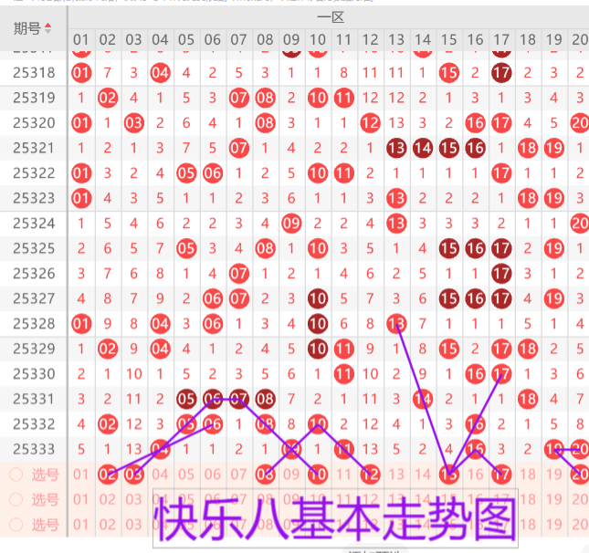 我们先来看下一区的基本走势情况,上期开出了六枚开奖号码,本期预测开出3-4枚开奖号码,首先我们哎看01 02 03的空位回补,建议三选一。08 10 12的三角叉走势建议三选一。16重号的那边形态15 17建议二选一。19 20重号二选一。
