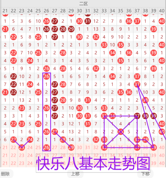 我们来看下二区的基本走势情况,上期开出了七枚开奖号码,本期预测开出4-5枚开奖号码,首先我们来看23的夹号形态。26的321形态走势,重点防守遗漏14期的29,23 26 29同路三码建议三选一或者三选二。33 37的交叉走势建议二选一。分边形态的31 39建议二选一。