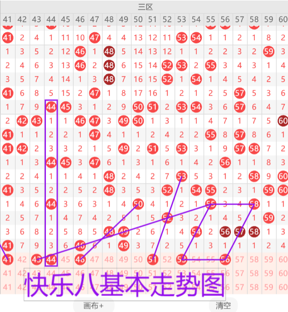 我们来看下三区的基本走势情况,上期开出了三枚开奖号码并且断五区。本期预测三区开出4-5枚开奖号码,首先我们来看斜连第五期的41. 41 46重号建议二选一或者同出,斜连第五期的43,上下对称走势的44. 43 44建议二选一或者同出。51 53 56同为三斜连形态建议三选一。
