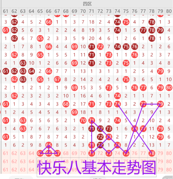 我们来看下四区的基本走势情况,上期开出了四枚开奖号码,本期预测开出5-6枚开奖号码,首先我们来看孤码66,首先看分边65 67同出或者二选一,或者66走重。71的回首掏,73的空心梅花。75的斜连第五期。重点防守冷号78的开出。