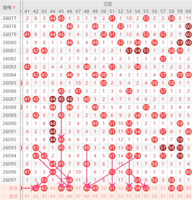 而三区的打底号是42.45.46.48.49.51.53.56.55.中参考3-4码开出机会,