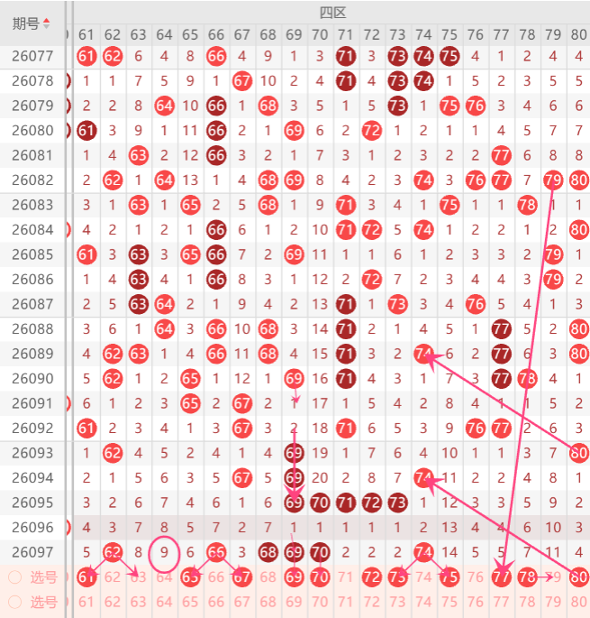 四区在近期的走势上来判断机会的话,整体区间是个走热形态,上期四区间开出了6码,上期四区间开出的形态是空位回补和隔期回补走势,上期小妹在文章布局到了2那么本期四区间我们重点关注的形态是重码走势,孤码分边,空位回补,那么本期首先注意重码走势上的62.68.69.中选择2码走重机会,而孤码分边上注意61.63.65.73.75.中选择1-2码分边机会,至于空位回补上的64.76.77.79.78中防守1-2码回补机会,上期重点关注在空位回补上布局到了4码开出,那么本期重点关注在孤码分边上布局一码订胆机会,如图所示