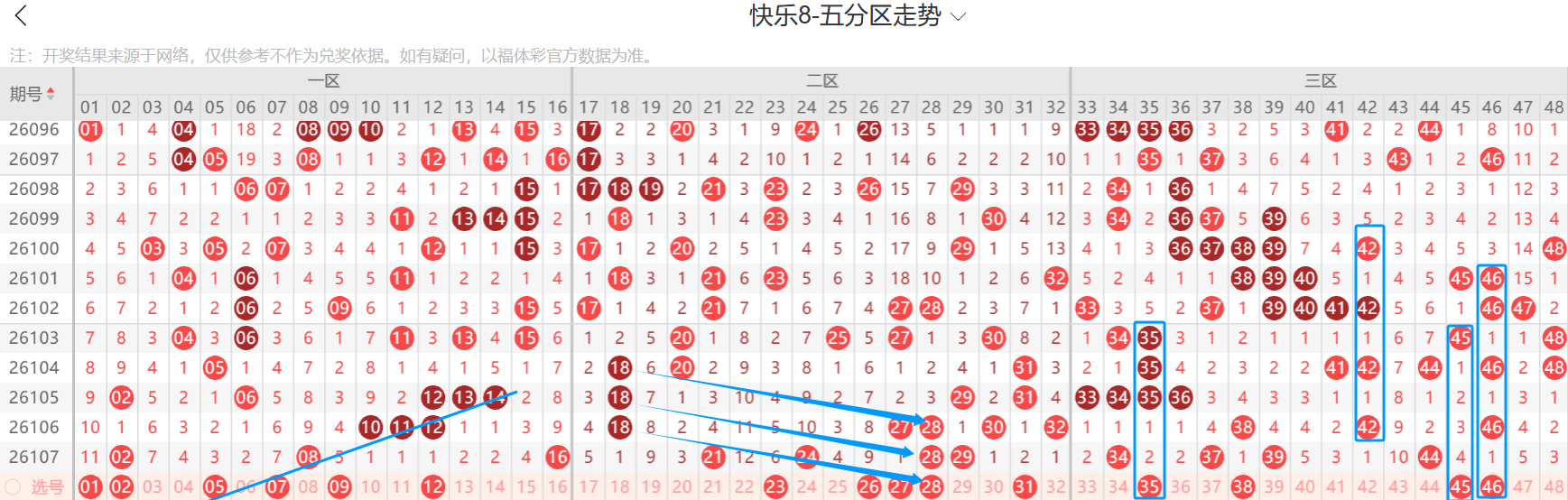 三区关注5尾35.45出一个,倾向45,关注8尾38.48出一个,注意45.46出连号,看这个位置出连号的需求非常强烈,结论是三区重点关注35.38.45.46,三胆38.45.46,双胆38.45,三区号应该不会太多,四个足已。