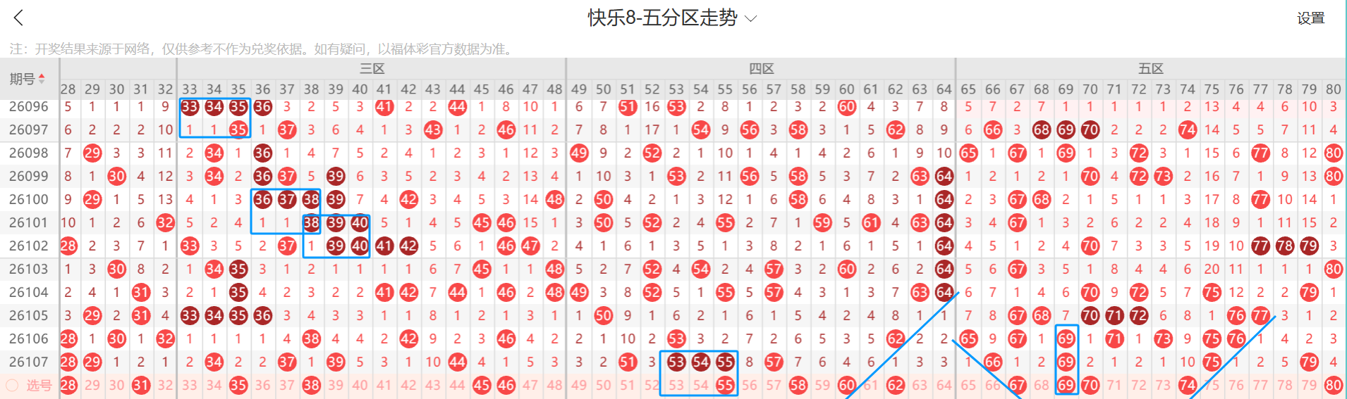 来看四区,注意近期的三连号特点,非常喜欢出重复号第三位,比如33.34.35重复35,比如36.37.38重复38,再比如38.39.40重复40,那么本期的55你要不要带,大家可以仔细看看这个点位,其次关注58.60.62看好四区有028尾,本期四区有望再热一区,重点关注四码55.58.60.62三胆55.58.60,双胆55.58,主胆55.五区首先关注7尾的67.77出号一个,关注重复号69,关注0尾的70.80出号,注意冷号74开出,结论是五区四胆69.70.74.80三胆69.74.80,双胆74.80.