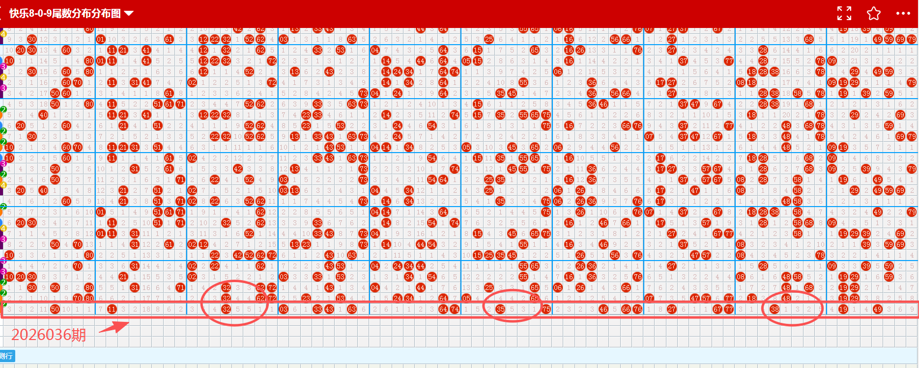 上图是快乐八2026036期的尾码走势图,从图中看0尾到9尾出号个数依次是:0尾号码区开出1个;1尾号码区开出1个;2尾号码区开出1个;3尾号码区开出4个;4尾号码区开出2个;5尾号码区开出2个;6尾号码区开出3个;7尾号码区开出3个;8尾号码区开出1个;9尾号码区开出2个;再看小尾号码(0尾-4尾)区有9码,大尾号码(5尾-9尾)有11码;数据比对统计后可以看到本期3尾出号数量最多,一共开出了4个中奖号码。本期没有尾出现断区!由走势比对推断2026037期重点需要关注2、5、8尾区号码下号热度回补和落号数量增加的概率较大。