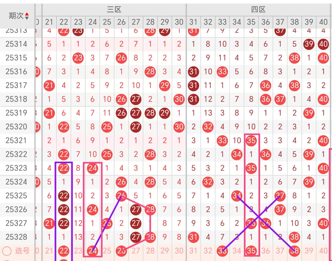 三区:(21-30):22空一遗漏对称,23是大遗漏号码,如果考虑选二可以做,22-23或者是23-24要注意23大遗漏回补!24三码斜连,空二空二遗漏对称,26形态对称码,图片上有标注!