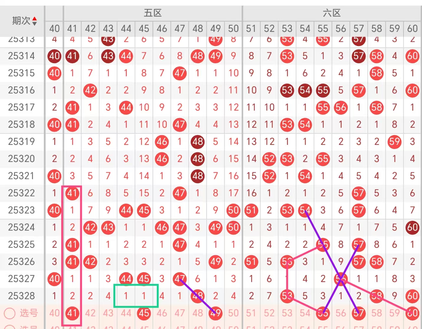 五区:(41-50):41遗漏对称号码,40下41的走势近期还是挺多的,40-41也是齐头下一,45齐头下一号码,49三码斜连号码!