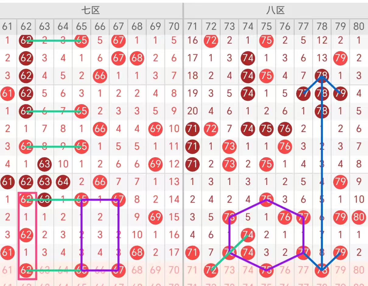 七区(61-70):62号码空一空一遗漏对称号码,61下62近期也是走势频繁,65空一空二空三遗漏阶梯走势,62-65同出走势近期出现4次,67是孤码68的边码!