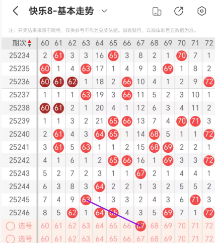 67码,遗漏间隔为3.16.3,形态为ABA,且如上图所示,与往期奖号63 65码形成一个隔1的斜3连,所以看好。