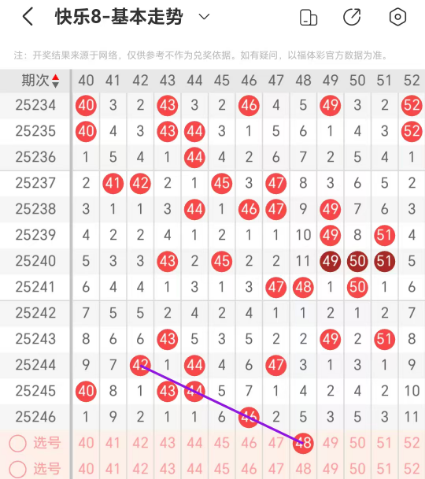 48码,如上图所示,与往期奖号42 44 46码形成一个隔1的斜4连,所以看好。
