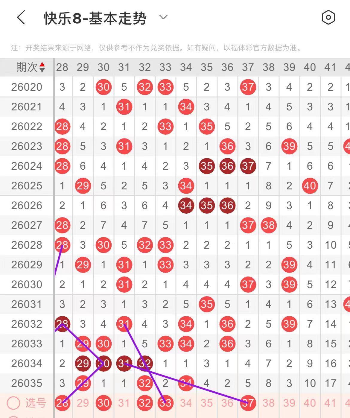 21-30区:本区间上期开出了三个号码,从号码走势图上看,该区现属于温热区,本期重点关注后半区号码回补,出号个数在三个号码左右,有出号走势的号码有24.26号,均有斜连出号走势,28号,回首掏斜连出号走势,防28.30同出。