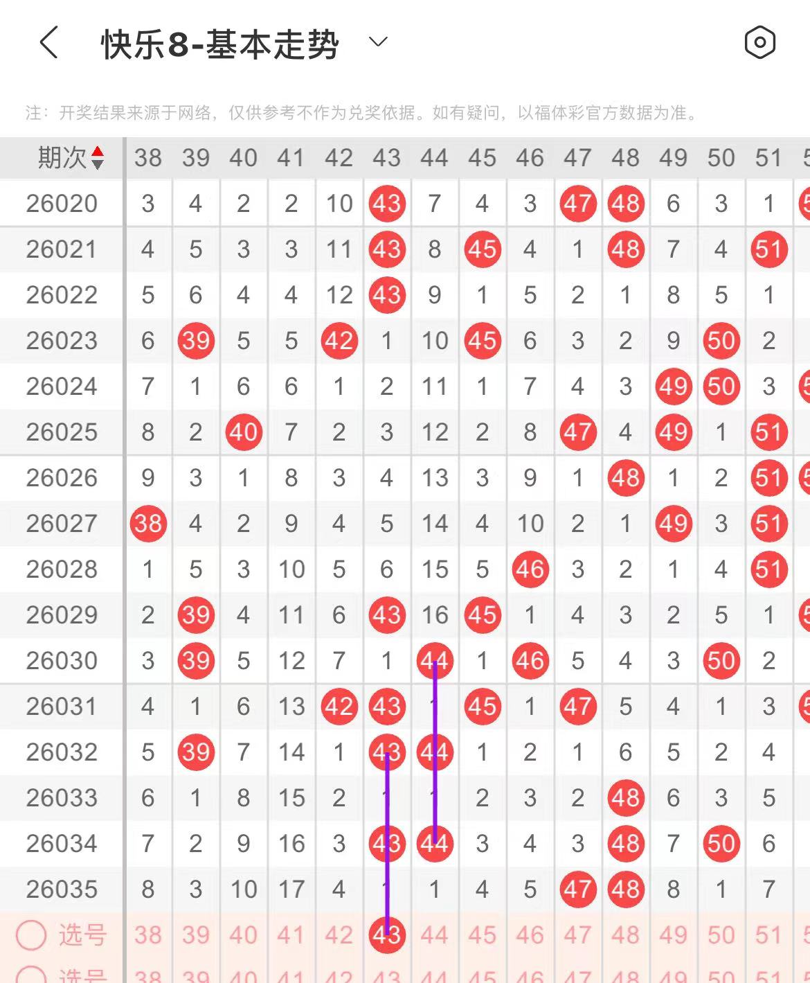 41-50区:本区间上期开出了两个号码,从号码走势图上看,该区现属于温冷区,出号个数不稳定,在选号上建议以防为主,待其号码走势平稳后再着手考虑。本期有出号走势的号码有43号,隔期相同出号走势。