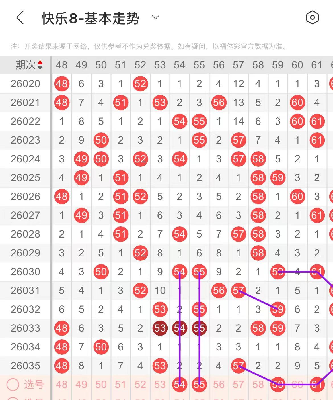 51-60区:本区间上期开出了两个号码,从号码走势图上看,该区断区后回补了两个号码,本期继续关注该区号码持续回补,出号个数在三个号码左右,有出号走势的号码有54.55号,隔期相同出号走势,59号,57对应59出号走势。
