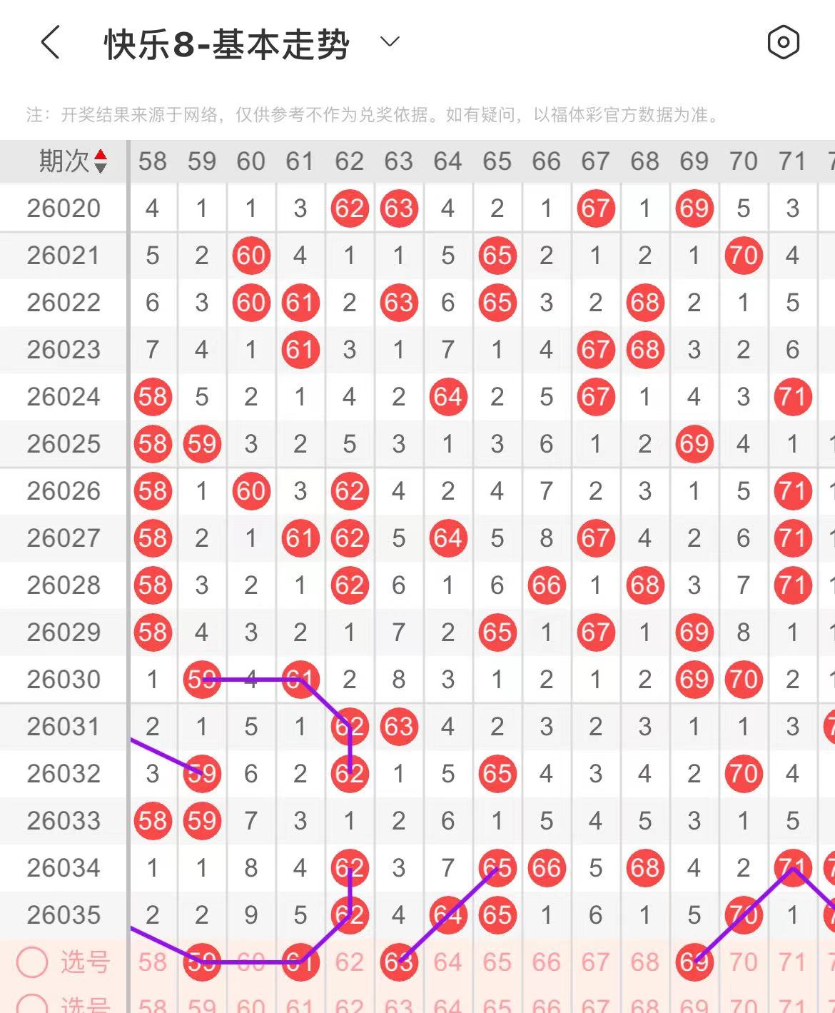 61-70区:本区间上期开出了四个号码,从号码走势图上看,该区现属于温热区,连续两期出号个数增多,本期在选号上需谨慎,更多的做为防范,本期有出号走势的号码有61.63号,做为分边出号考虑,69号,斜连出号走势。