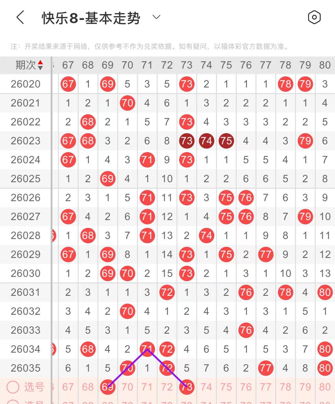 71-80区:本区间上期开出了三个号码,从号码走势图上看,该区现属于温号区,出号个数在一两个号码左右,有出号走势的号码有73号,斜连出号走势。