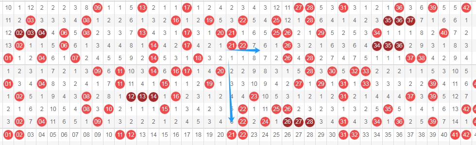 上图是福彩快乐8开奖号码走势分布图其中一部分走势图,这个区域的数字是从01到42,我在上面走势图中标注出来的数字都是1尾数数字和2尾数数字组成的连号组合,一共是5组,这些连号组合有0102 1112 2122 3132 4142这些连号组合一共连续6期没出现,经常关注福彩快乐8的朋友应该知道,福彩快乐8开出的连号组合是比较多的,那么本期可以关注这些连号组合出一组或两组,个人最看好0102 4142 1112。